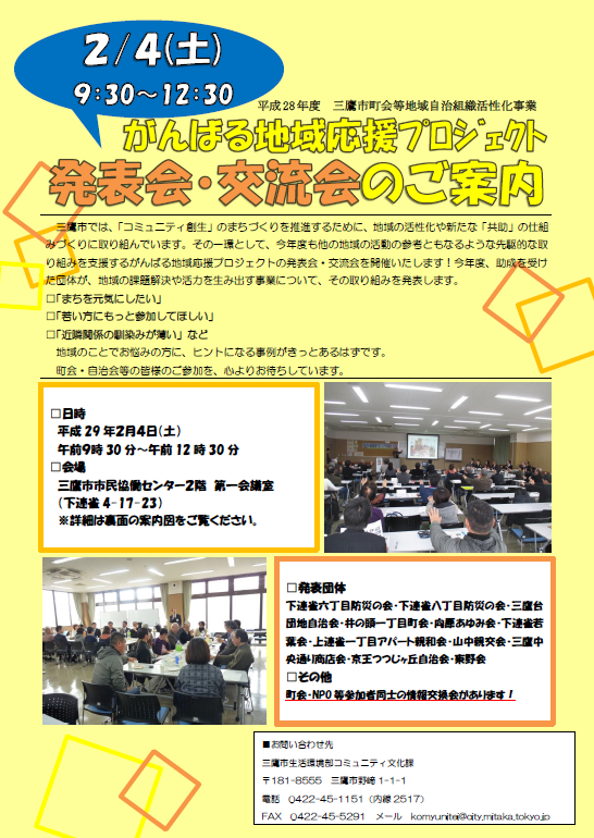 三鷹市では、「コミュニティ創生」のまちづくりを推進するために、地域の活性化や新たな「共助」の仕組みづくりに取り組んでいます。その一環として、今年度もがんばる地域応援プロジェクトの発表会・交流会を開催いたします!