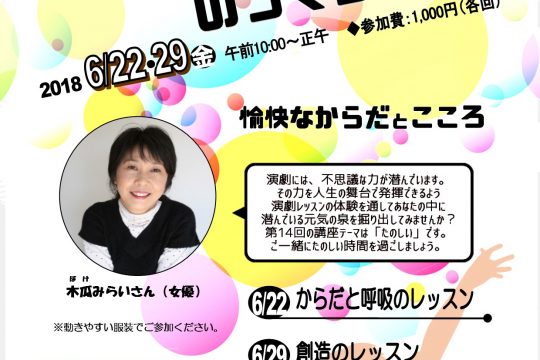 【終了】≪「演劇的元気のつくり方」講座≫ を開催します 2018.05.31 イベント 愉快なからだとこころ 演劇には、不思議な力が潜んでいます。その力を人生の舞台で発揮できるよう、演劇レ... 続きを読む